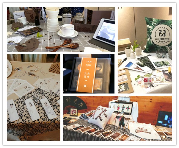 在北面车库展厅,主要是品牌策划与推广类。在这里,陈列着各色充满设计感的笔袋、书签、胸章等,不由得让人眼前一亮;而另一边以泰国餐厅曼廊为主题的一组更是引入了如今大热的VR,仿佛置身于餐厅内,坐着期待美味的菜肴。而中国美术导报组也准备了供人品尝的功夫茶,在三五道工序之后细细品尝茶香,歇闲暇之余把玩充满彝族风情的手帕、书签,好不惬意。