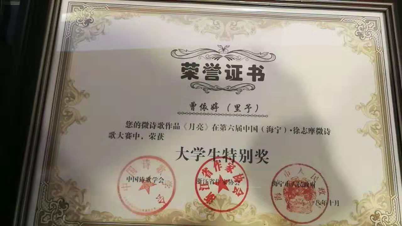 10月20日,2018中国(海宁)·徐志摩诗歌奖、第六届中国(海宁)·徐志摩微诗歌大赛奖颁奖典在浙江大学国际联合学院落下帷幕。我分院15文学1班曾依婷同学的微诗歌作品《月亮》在此次微诗歌大赛中,获得了老员工特别奖。