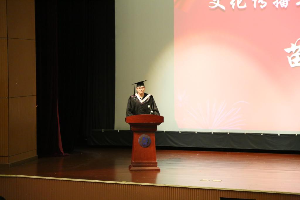 15文学1班苗成浩作为毕业生代表上台发言。他表达了对母校的感谢和不舍,希望学弟学妹们传承分院博雅文化精神,把这种精神发扬光大。
