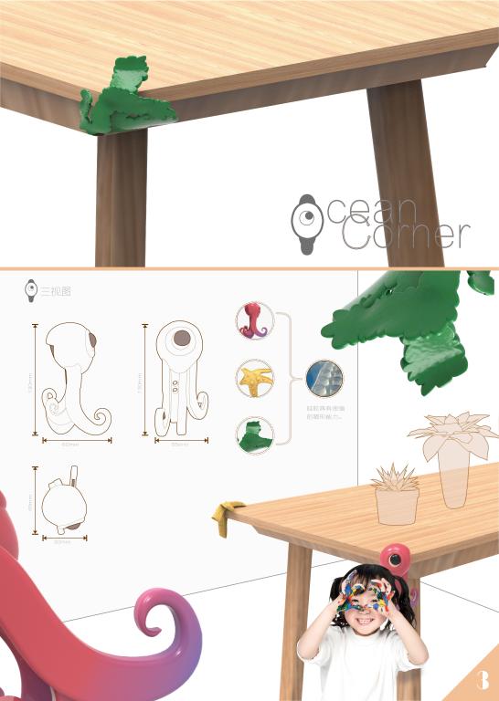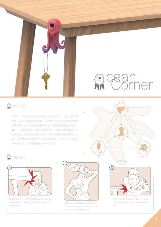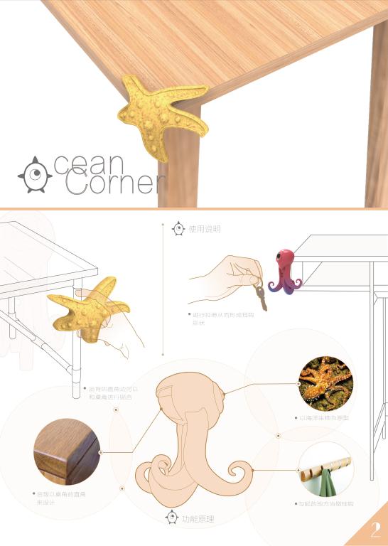 《Ocean Coner》作品设计说明:在室内,经常会有以锐利边角为造型的桌子、柜子、茶几等家具,从而造成磕碰等问题。而这款产品则是用海洋生物为主要元素,加以改进的防撞装饰物。普通的防撞条有方便、廉价、朴素等特点,但是也有寿命短,造型不美观等缺点。而这款加以改造的防撞装饰物可以弥补普通防撞条的造型问题。以软硅胶为主材料并可以将边角弯折,弯折后可以起到钩子的作用,对桌面整理也有一定作用。