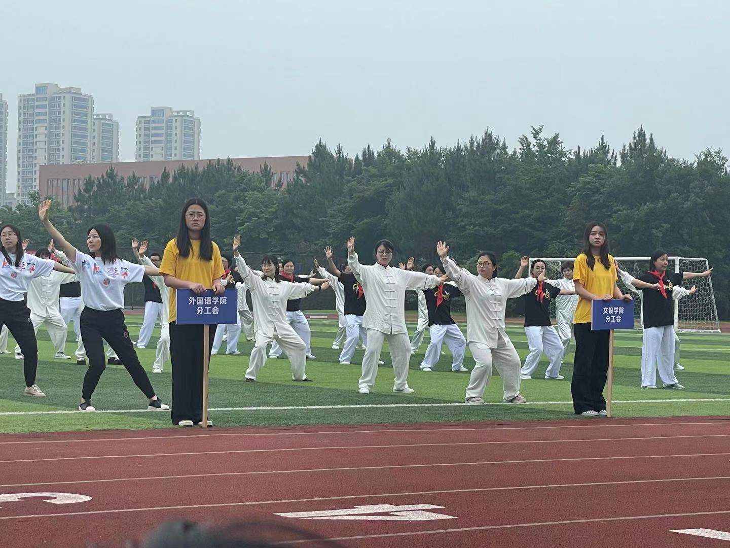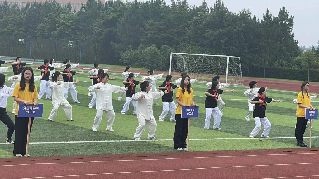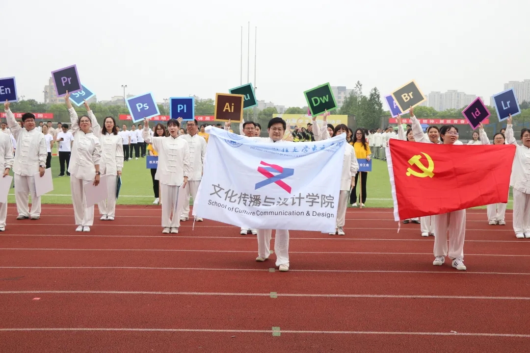 下午的方阵表演,文设教师运动员在主席台前喊出响亮的口号“展奋发英姿、庆建党百年、扬博雅精神、筑同心圆梦”,手持各种设计软件图标,尽显文设人特色;八段锦表演赛,运动员们不负前期利用午间半小时训练的辛苦,动作整齐划一、从容标准,获得了一等奖的好成绩。