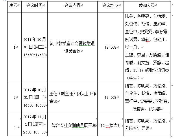 各位老师: 兹定于下周二、周三召开工作会议及综合专业实训成果展开幕式,请相关人员准时出席,望相互转告。