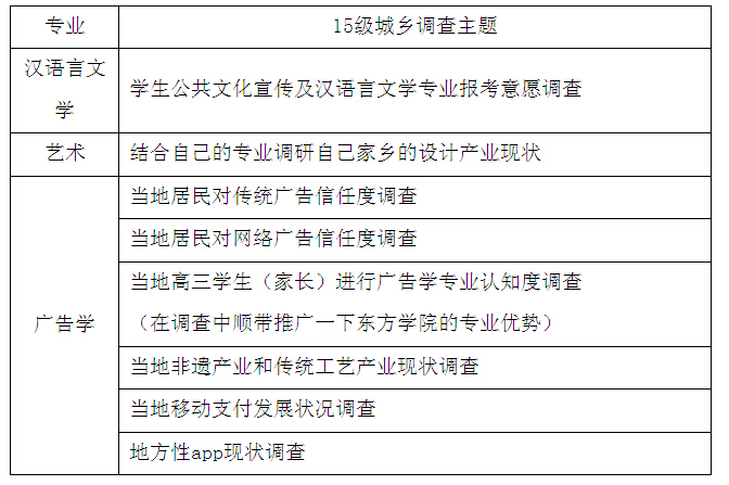2015级本科各专业员工城乡社会调查安排在2016年7月-8月进行,实际调查实践天数不少于二周。“城乡社会调查”为1学分。
