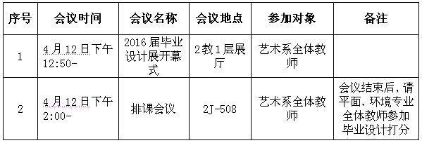 兹定于2016年4月12日(周二)下午召开如下会议,请相关人员准时出席,望相互转告。