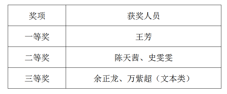 经评审,本届教师教学技能竞赛按总得分平均分高低评出一等奖1名,二等奖2名,三等奖2名。