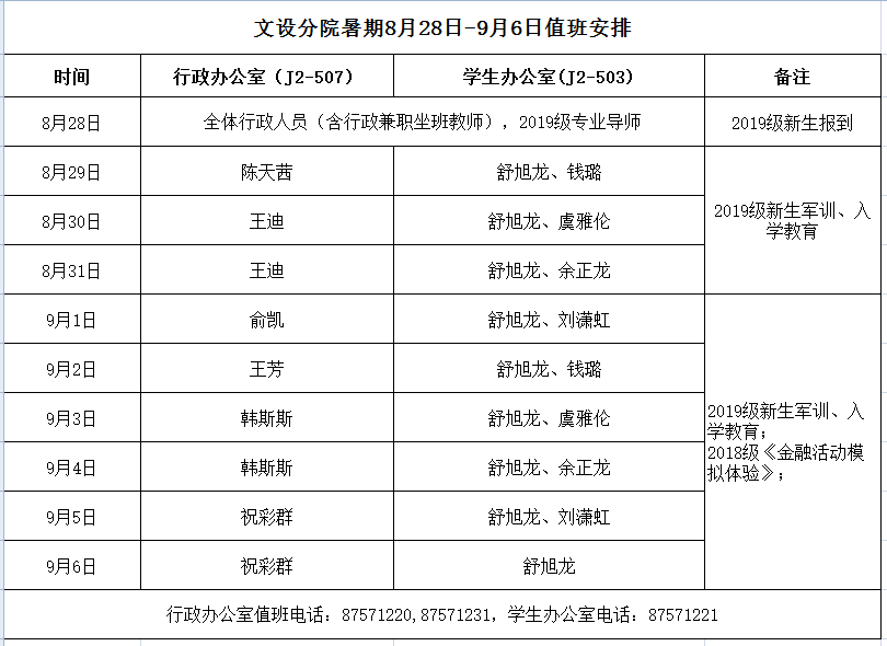 根据学院2019年暑期工作安排和分院实际,为保障分院暑期各项工作顺利开展,特制订值班安排如下: