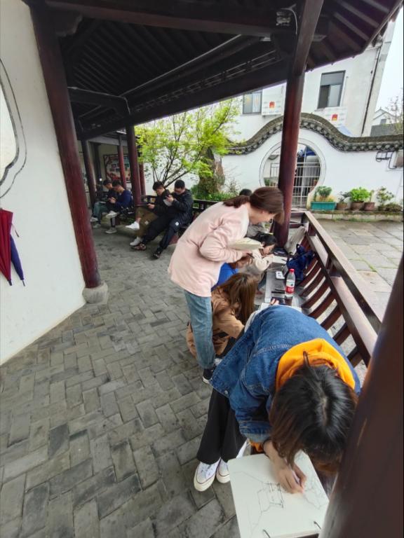 17环境设计系的同学自是不能放过如此诗意的新杭派建筑,结合考察任务,拿起马克笔手绘着建筑的韵律。