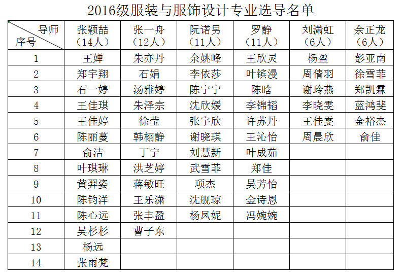 2016级服装与服饰设计专业选导名单已经确定,请见以下表格。