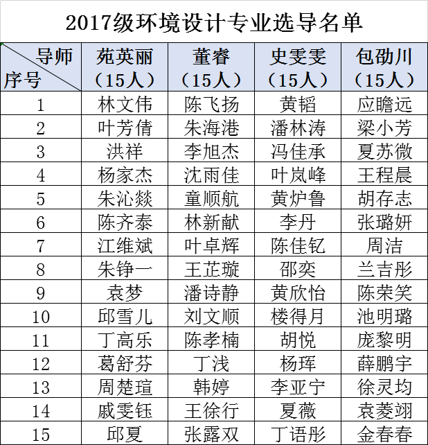 2017级环境设计专业选导名单已经确定,请见以下表格。