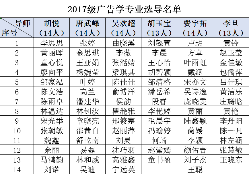 2017级广告学专业选导名单已经确定,请见以下表格。