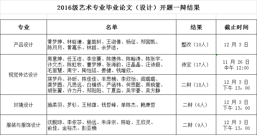 11月19日下午,我分院完成艺术四个专业毕业论文(设计)开题一辩工作,导师们就选题内容、表现手法及现阶段完成情况,经专业教师组讨论,现将一辩结果及后续安排通知如下:
